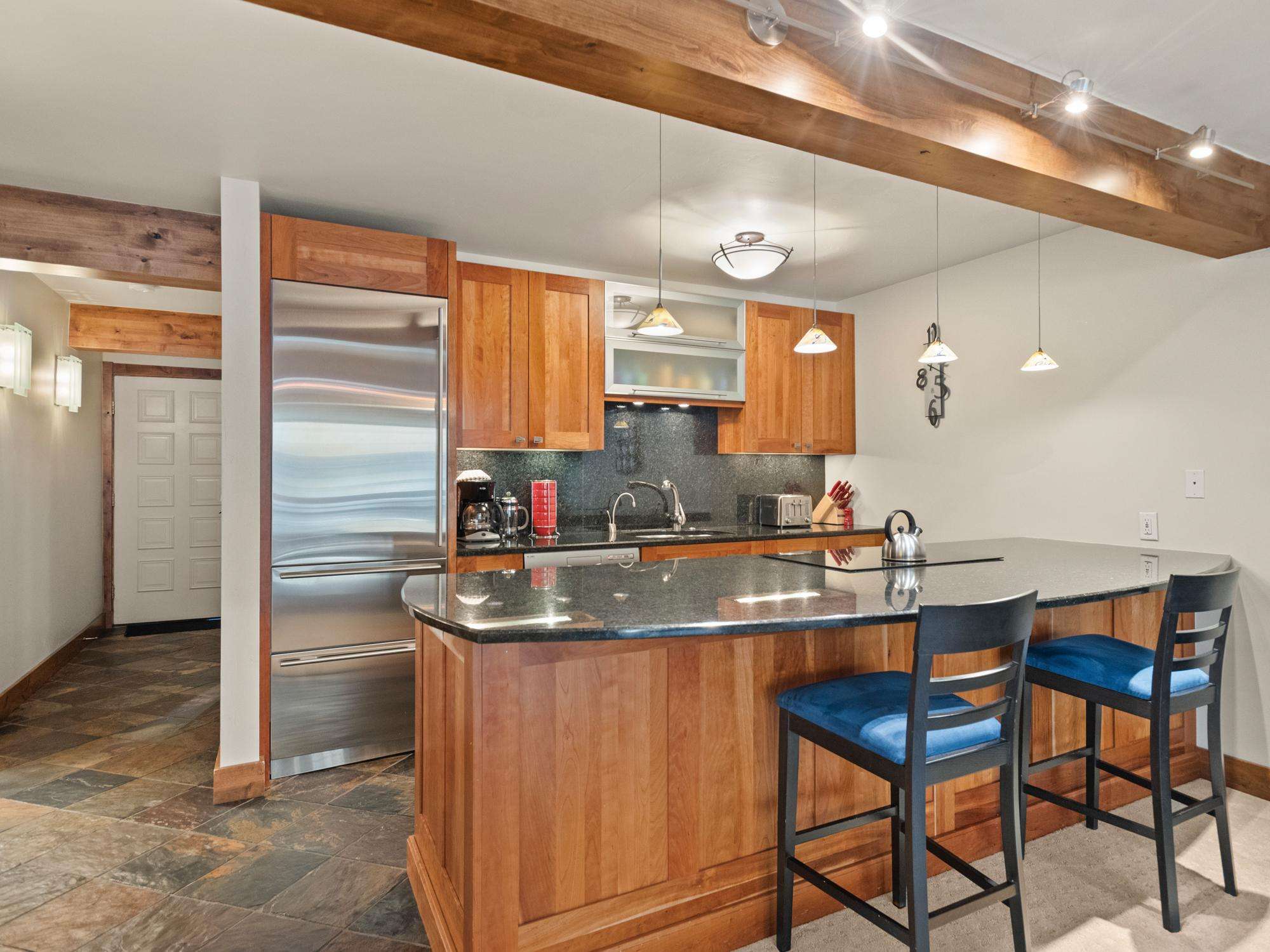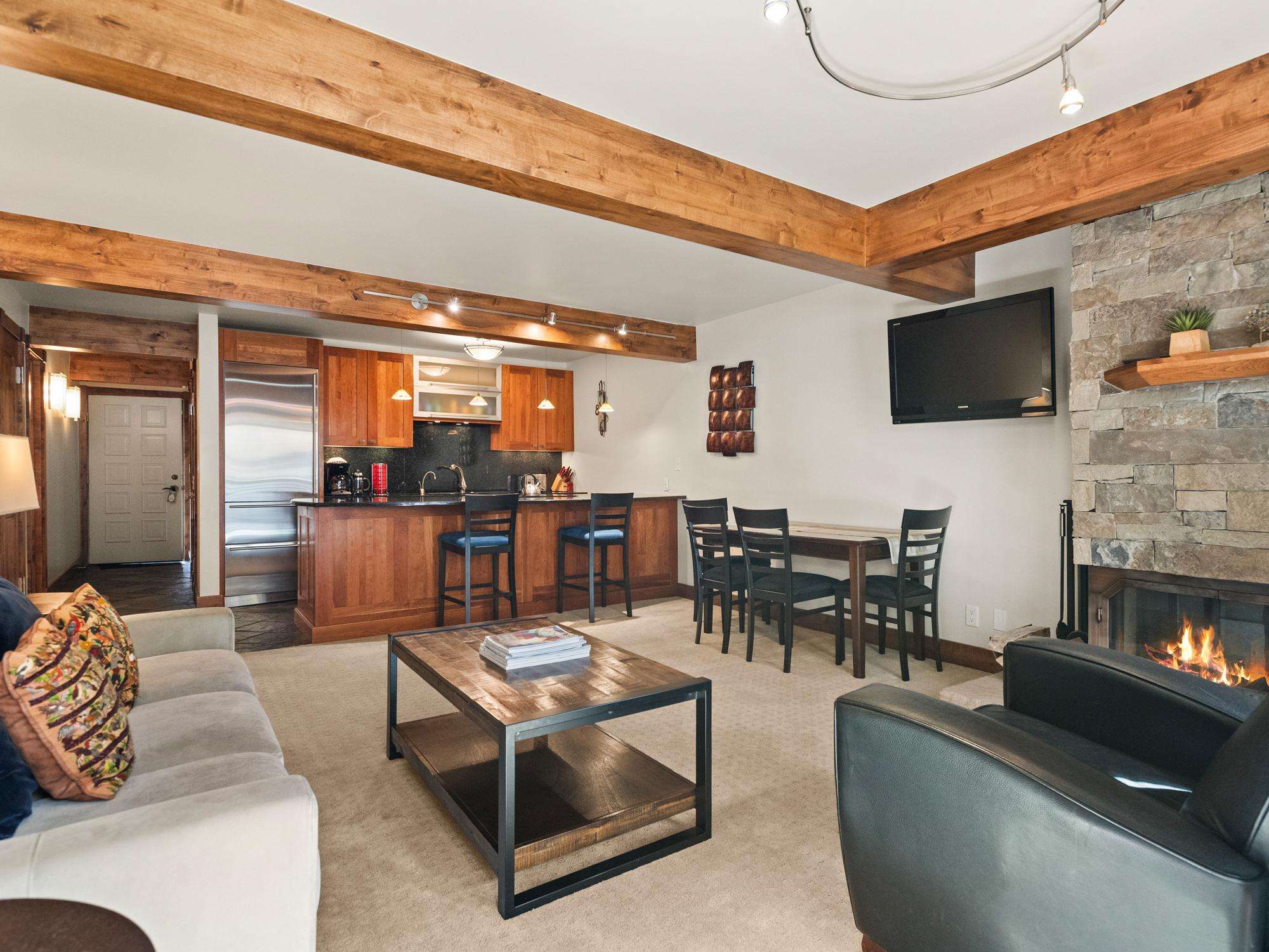 #309 is a mountain-side, 1 bedroom, stylish remodeled unit with a view of Aspen Mountain. The unit offers a king bed and a queen-sized fold out sofa. An extra adult or child can sleep here very comfortably. This condo has a beautiful kitchen with gorgeous granite counters and stainless steel appliances. There is a dining area and a stylish and comfortable living room with a wood burning fireplace. Outside the living area is a balcony with scenic views of Aspen Mountain.