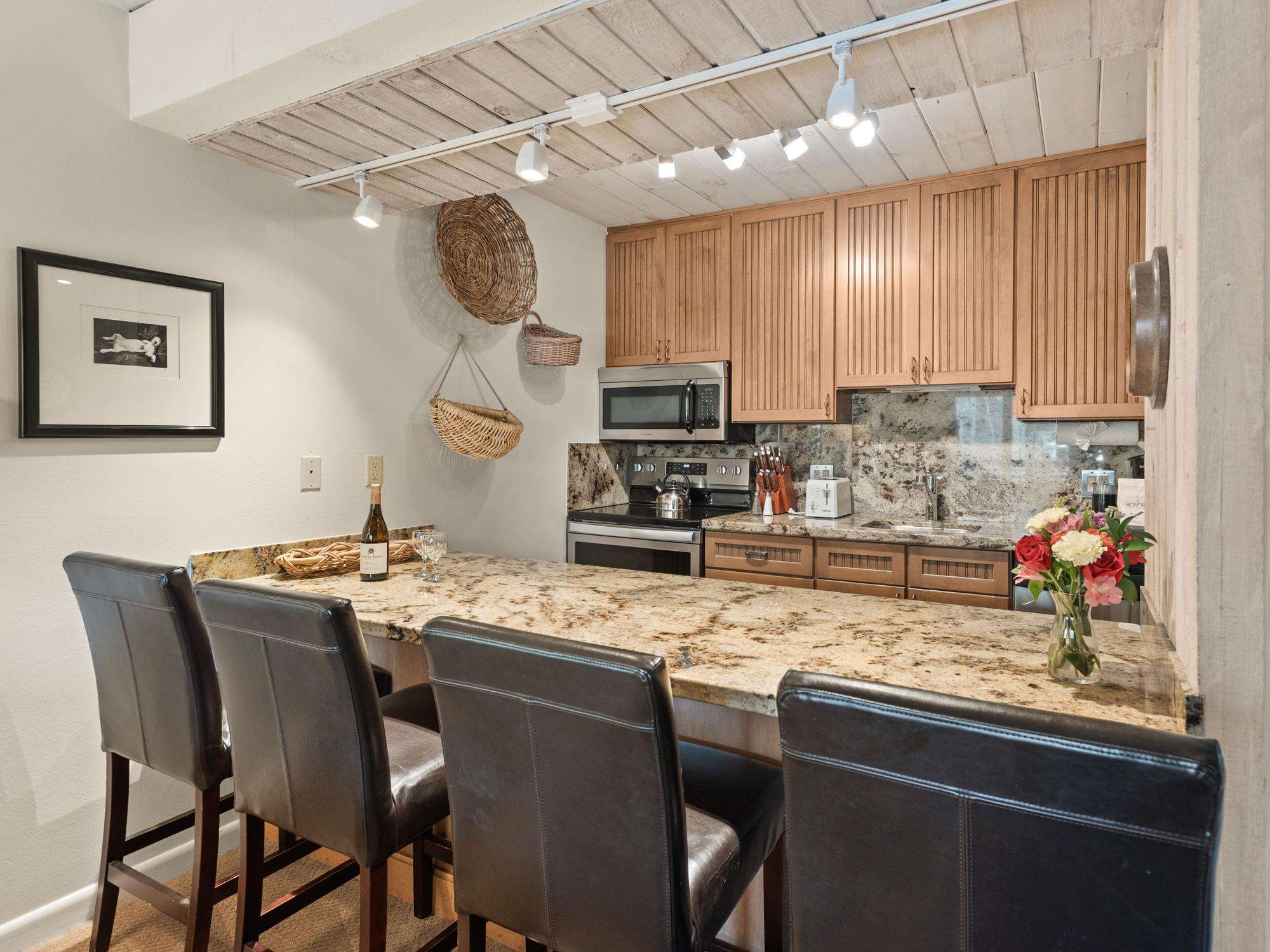 #202 is a second floor two bedroom unit. The primary bedroom features a king bed and an ensuite bathroom. The guest bedroom features a split king bed. The bathrooms are beautifully redone, one with a walk-in shower and the other with a tub/shower combination. The kitchen opens up to the living room creating a comfortable living area. Outside of the living room and master bedroom is a balcony with seating.