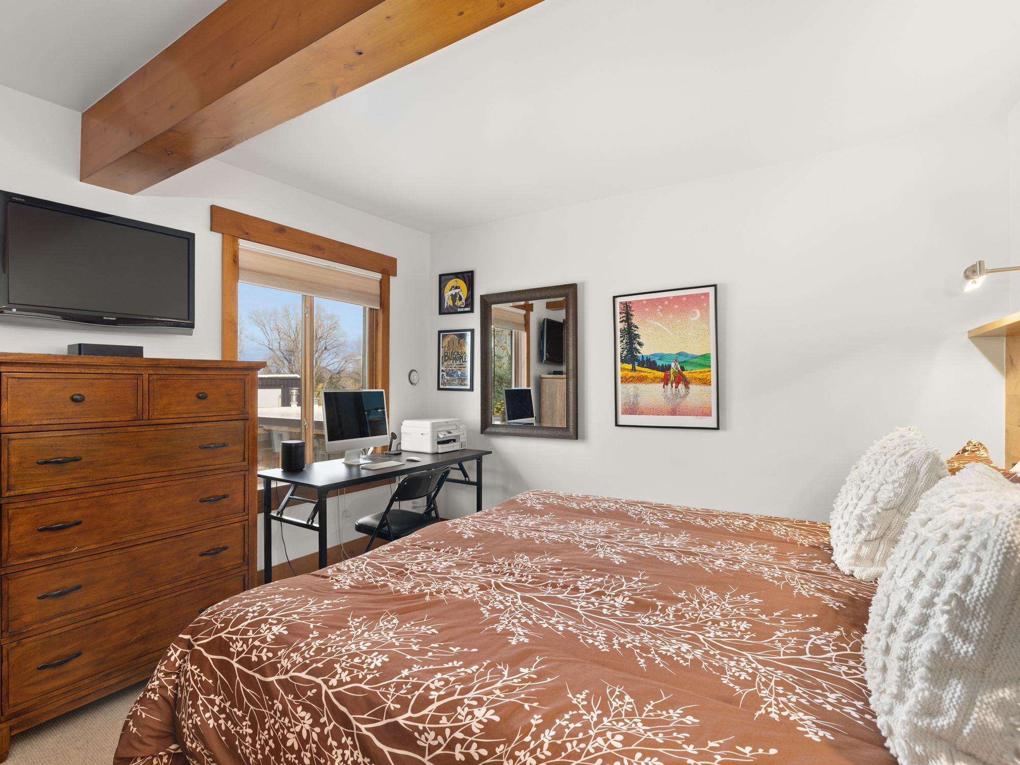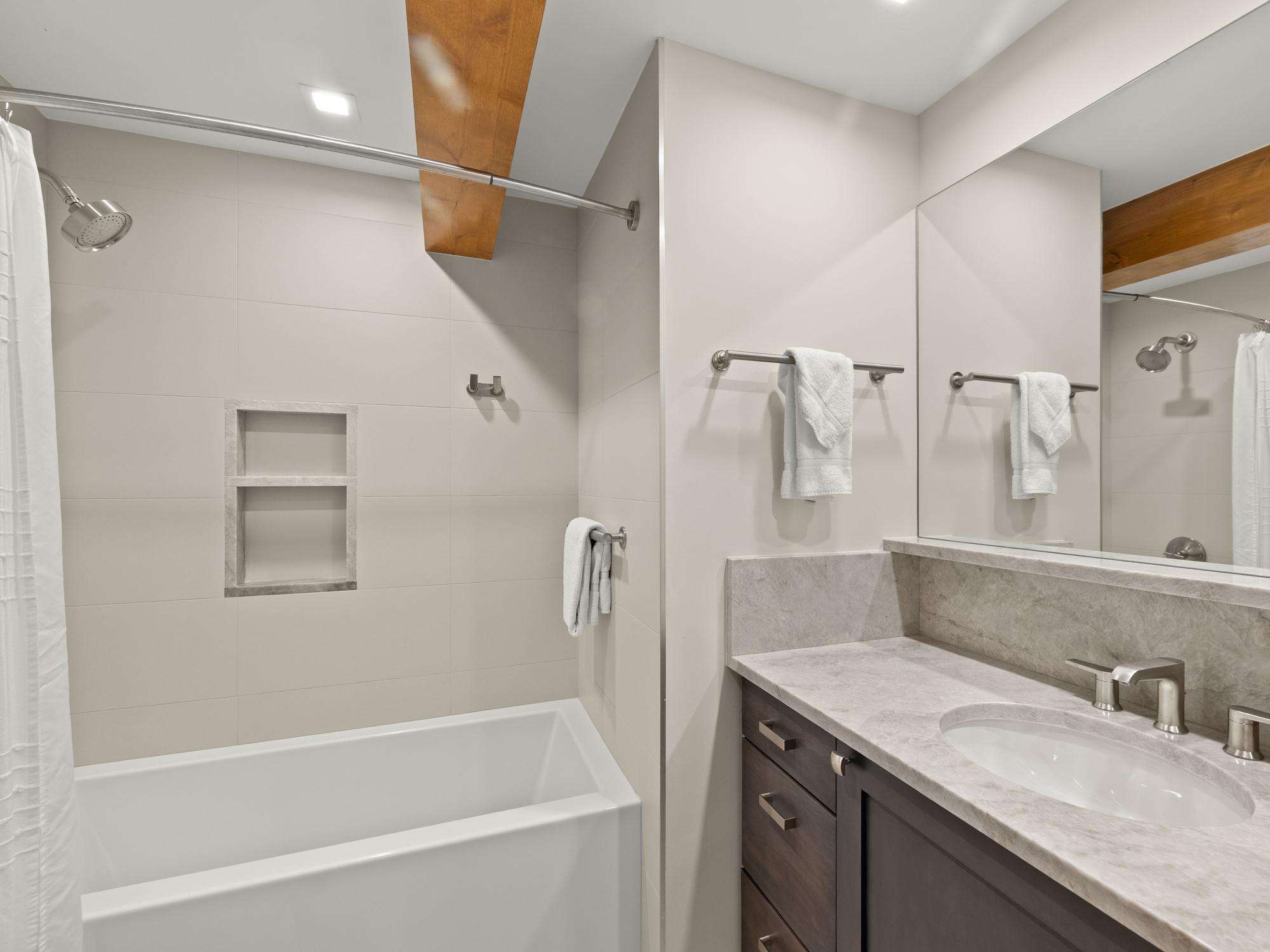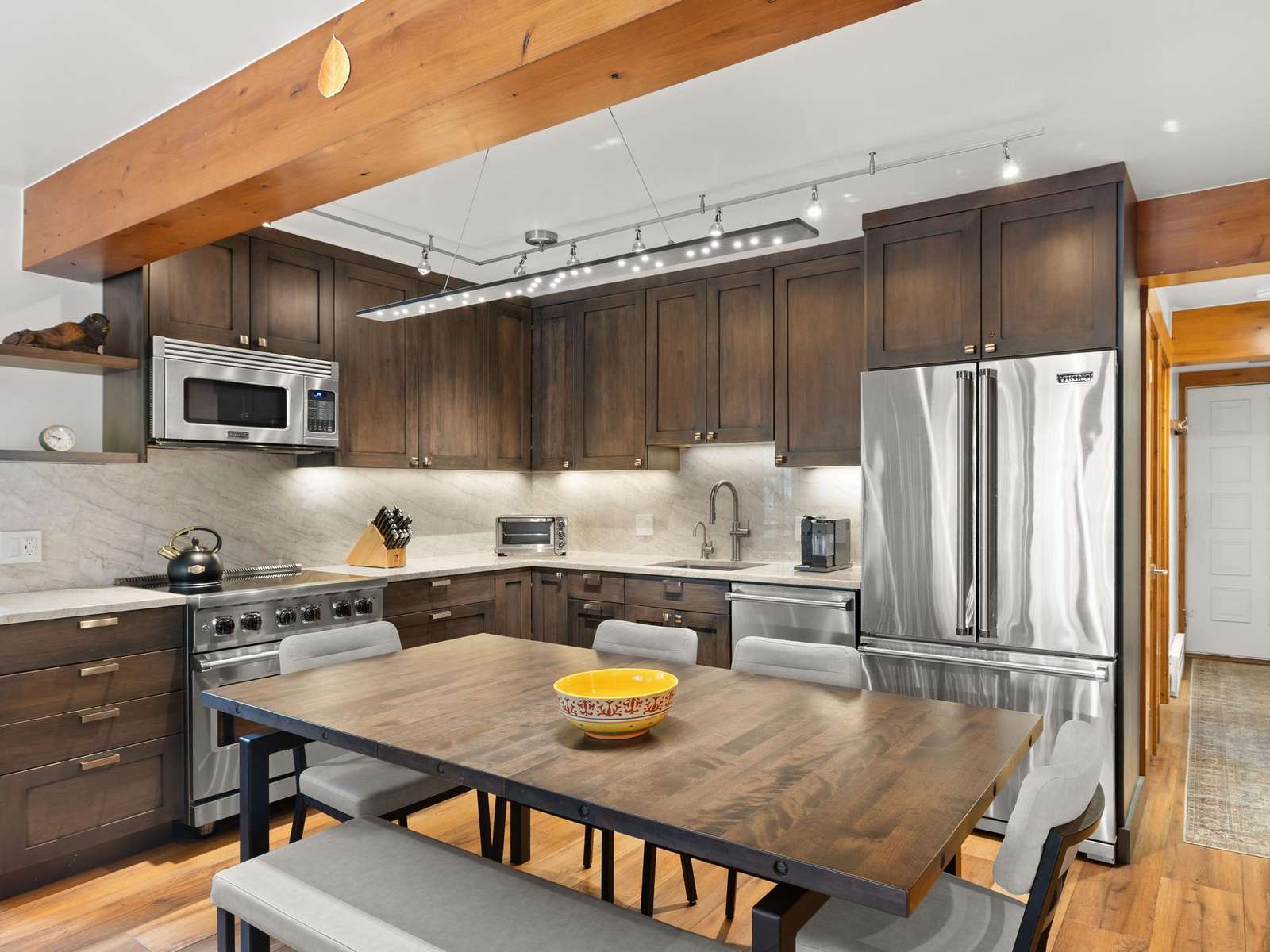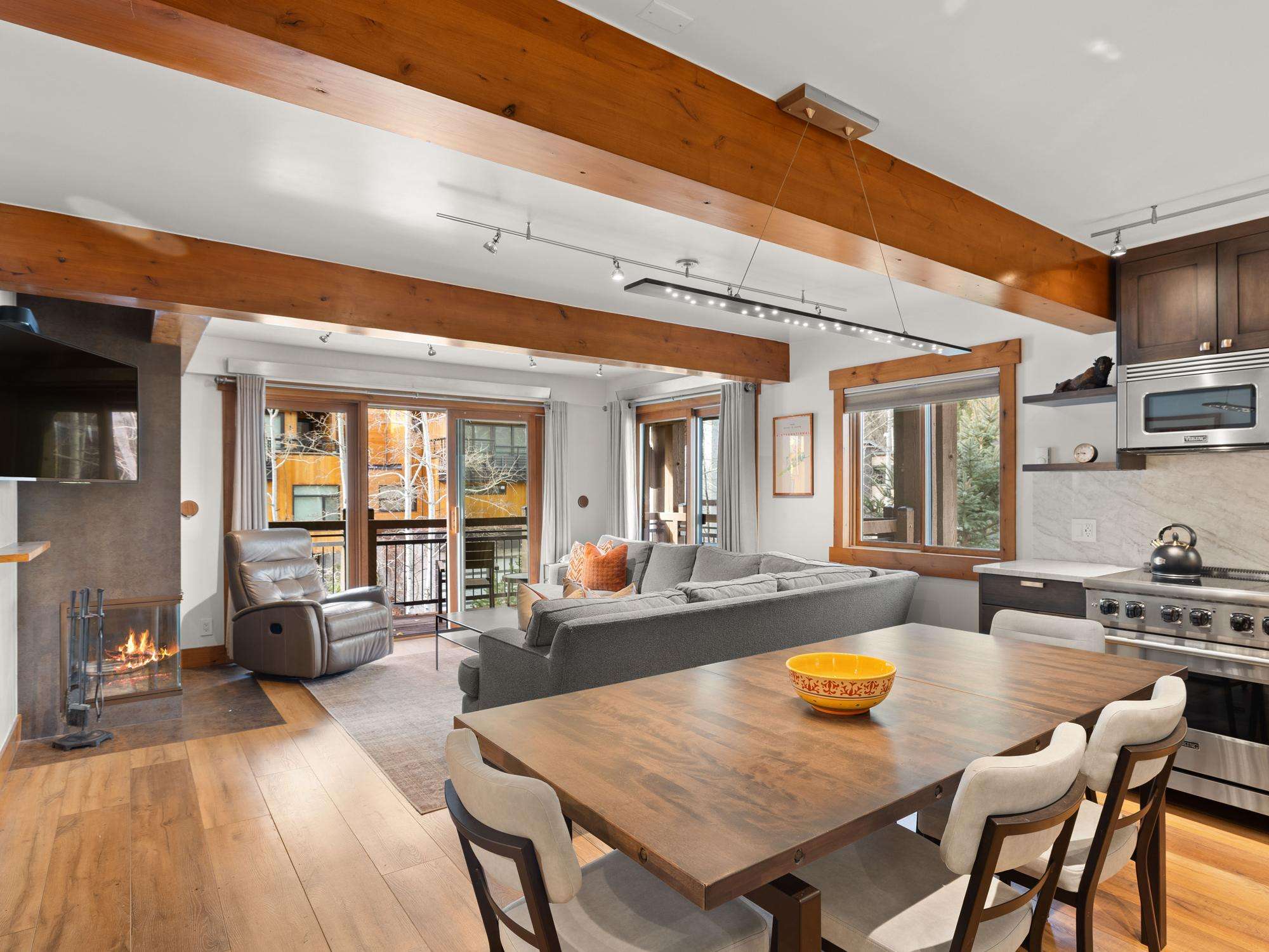 #410 is a top floor corner unit with stunning views. The primary bedroom and one of the guest bedrooms both feature ensuite bathrooms and king beds. The third bedroom offers a split king bed. The entire unit has been tastefully remodeled. The bar/counter has seating for 6 people and the living room features a warm and inviting fireplace with nice southern views. Outside the living area is a large wraparound balcony with views of Aspen Mountain.